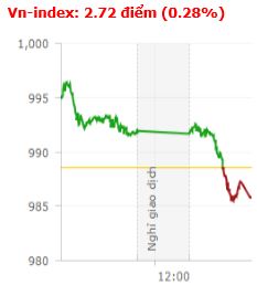 Đà tăng trong phiên sáng của thị trường bị đánh mất hoàn toàn trong phiên chiều. Các chỉ số bất ngờ gặp phải áp lực bán mạnh và đảo chiều giảm nhẹ xuống dưới tham chiếu. Kết thúc phiên giao dịch, VN-Index giảm 2,72 điểm (0,28%) xuống 985,81 điểm với khối lượng giao dịch đạt 236 triệu CP, trị giá 4.934,3 tỷ đồng; Hnx-Index giảm 0,24 điểm (0,22%) xuống 107,48 điểm với khối lượng giao dịch đạt 29,28 triệu CP, trị giá 409,87 tỷ đồng.