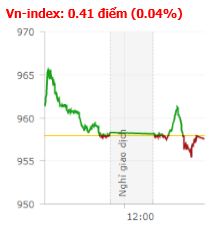 Sau phiên giảm mạnh hôm qua, sắc xanh đã manh nha quay trở lại trên thị trường, nhưng chưa có sự đồng thuận trên 2 chỉ số khi kết phiên. Kết thúc phiên giao dịch, VN-Index giảm 0,41 điểm (-0,41%) xuống còn 957,56 điểm với khối lượng giao dịch đạt 145,34 triệu CP, trị giá 3.355 tỷ đồng; HNX-Index tăng 0,41 điểm (0,39%) lên 105,83 điểm với khối lượng giao dịch đạt 50,1 triệu CP, trị giá 561,13 tỷ đồng.