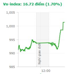 Chứng trường Việt Nam bứt phá ấn tượng trong phiên hôm nay, chính thức chinh phục mốc tâm lý 1.000 điểm. Kết thúc phiên giao dịch, VN-Index tăng 16,72 điểm (1,7%) lên 1.001,32 điểm với khối lượng giao dịch đạt 208,2 triệu CP, trị giá 4.802,35 tỷ đồng; HNX-Index tăng 1,23 điểm (1,14%) lên 109,55 điểm với khối lượng giao dịch đạt 64,6 triệu CP, trị giá 692 tỷ đồng.