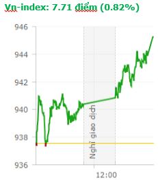 VN-Index giao dịch khá giằng co trong phiên sáng, nhưng phiên chiều chỉ số liên tục bật tăng mạnh mẽ, đánh dấu phiên tăng điểm thứ 3 liên tiếp, hướng tới mục tiêu mới là 950 điểm. Kết thúc phiên giao dịch, VN-Index tăng 7,71 điểm (0,82%) lên 945,25 điểm với khối lượng giao dịch đạt 215,3 triệu CP, trị giá 4.992,13 tỷ đồng; HNX-Index tăng 0,45 điểm (0,42%) lên 106,49 điểm với khối lượng giao dịch đạt 30,98 triệu CP, trị giá 405,7 tỷ đồng.