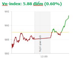 | Tổng hợp: Diễn biến khá giằng co trong phiên sáng, song bước vào phiên chiều lực cầu gia tăng mạnh giúp cả 2 chỉ số có phiên tăng điểm khá tốt, đi theo xu hướng phục hồi chung của chứng khoán Châu Á. Kết thúc phiên giao dịch, VN-Index tăng 5,88 điểm (0,6%) lên 993,49 điểm với khối lượng giao dịch đạt 197,4 triệu CP, trị giá 4.696,4 tỷ đồng; HNX-Index tăng 0,84 điểm (0,74%) lên 113,6 điểm với khối lượng giao dịch đạt 61,4 triệu CP, trị giá 727 tỷ đồng.
