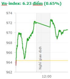 Thị trường phân hóa, nhưng vẫn giữ được sắc xanh nhờ một số mã vốn hóa trụ cột trên thị trường. Kết thúc phiên giao dịch, VN-Index tăng 6,23 điểm (0,65%) lên 970,58 điểm với khối lượng giao dịch đạt 170,9 triệu CP, trị giá 4.002,9 tỷ đồng; HNX-Index tăng 0,09 điểm (0,09%) lên 106,3 điểm với khối lượng giao dịch đạt 30,81 triệu CP, trị giá 395,3 tỷ đồng. Điểm tích cực trong phiên hôm nay là đà mua ròng của khối ngoại vẫn được duy trì ở mức cao, mặc dù thanh khoản thị trường sụt giảm. Cụ thể, trên sàn HSX, khối ngoại giao dịch trị giá 1.883 tỷ đồng với giá trị mua ròng đạt 249,5 tỷ đồng. Trên sàn HNX, họ giao dịch trị giá 27,2 tỷ với giá trị mua ròng đạt 12,74 tỷ đồng. Tính chung trong phiên hôm nay khối mua ròng với giá trị đạt 262,3 tỷ đồng trên 2 sàn.