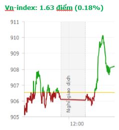 Đóng cửa trong sắc xanh, song xu hướng chủ đạo trong phiên là sự giằng co với thanh khoản ở mức thấp. Kết thúc phiên giao dịch, VN-Index tăng 1,63 điểm (0,18%) lên 908,18 điểm với khối lượng giao dịch đạt 129,14 triệu CP, trị giá 2.659,7 tỷ đồng; HNX-Index tăng 0,14 điểm (0,13%) lên 102,67 điểm với khối lượng giao dịch đạt 23,07 triệu CP, trị giá 293,43 tỷ đồng.
