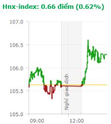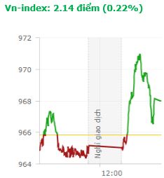 Diễn biến trong phiên giao dịch chiều sôi động hơn hẳn so với phiên sáng khi dòng tiền hoạt động tích cực hơn, giúp thị trường đảo chiều tăng điểm trên cả 2 sàn. Kết thúc phiên giao dịch, VN-Index tăng 2,14 điểm (0,22%) lên 968 điểm với khối lượng giao dịch đạt 154,9 triệu CP, trị giá 4.128,76 tỷ đồng; HNX-Index tăng 0,66 điểm (0,62%) lên 106,29 điểm với khối lượng giao dịch đạt 29,5 triệu CP, trị giá 370,4 tỷ đồng.
