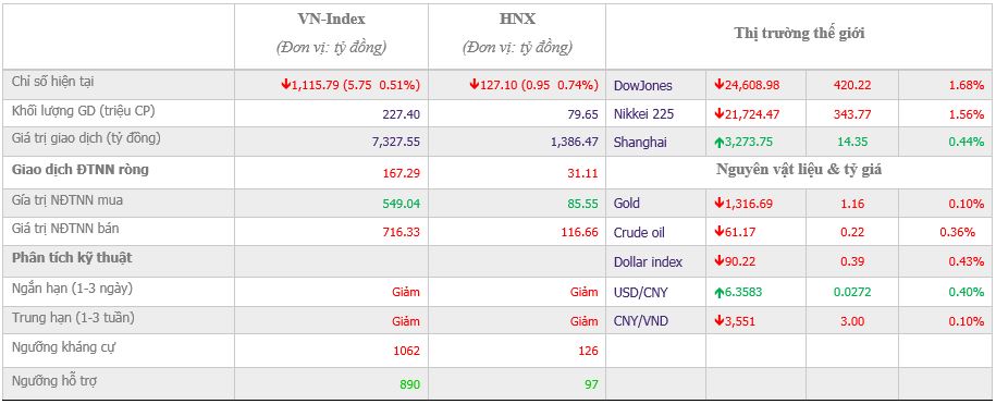 Áp lực chốt lời tăng mạnh ở nhóm CP đầu tàu như ngân hàng và dầu khí đã kéo thị trường giảm điểm trong phiên hôm nay. Kết thúc phiên giao dịch, VN-Index giảm 5,75 điểm (-0,51%) xuống 1.115,79 điểm với khối lượng giao dịch đạt 227,40 triệu CP, trị giá 7.327,55 tỷ đồng; HNX-Index giảm 0,95 điểm (-0,74%) xuống 127,1 điểm với khối lượng giao dịch đạt 79,65 triệu CP, trị giá 1.386.47 tỷ đồng.