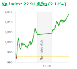 | Tổng hợp: Dù dòng tiền không quá mạnh, nhưng sự khởi sắc của nhóm cổ phiếu ngân hàng, cùng hàng loạt mã bluechip khác đã kéo các chỉ số tăng vọt trong phiên chiều. Kết thúc phiên giao dịch, VN-Index tăng 20,91 điểm (2,11%) lên 1.013,78 điểm với khối lượng giao dịch đạt 166.09 triệu CP, trị giá 5.091,79 tỷ đồng; HNX-Index tăng 2,57 điểm (2,22%) lên 118,32 điểm với khối lượng giao dịch đạt 55,68 triệu CP, trị giá 815,98 tỷ đồng. |