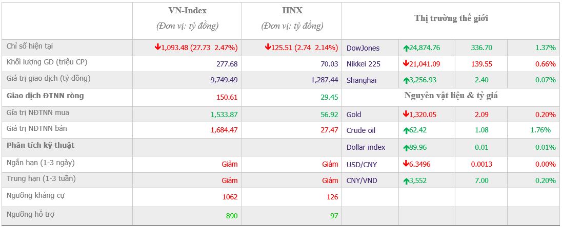 Áp lực bán dồn dập về cuối phiên đã lấy đi toàn bộ nỗ lực của VN-Index có được từ đầu phiên giao dịch. Các chỉ số đều đóng cửa ở sắc đỏ với các mức sụt giảm rất mạnh. Kết thúc phiên giao dịch, VN-Index giảm mạnh 27,73 điểm (-2,47%) xuống 1.093,48 điểm với khối lượng giao dịch đạt 277,68 điểm, trị giá 9.749,49 tỷ đồng; HNX-Index giảm 2,74 điểm (-2,14%) xuống 125,51 điểm với khối lượng giao dịch đạt 70,03 triệu CP, trị giá 1.287,44 tỷ đồng.