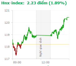 | Tổng hợp: Dù dòng tiền tỏ ra thận trọng, nhưng lực cầu duy khá tốt, giúp thị trường tăng vọt trong phiên chiều nay. Kết thúc phiên giao dịch, chỉ số VN-Index tăng 11,76 điểm (1,15%) lên 1.034,50 điểm với khối lượng giao dịch đạt 162,08 triệu CP, trị giá 5.003,53 tỷ đồng; HNX-Index tăng 2,23 điểm (1,89%) lên 120,42 điểm vơi khối lượng giao dịch đạt 48,56 triệu CP, trị giá 735,87 tỷ đồng. |