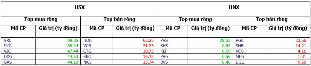 Khối ngoại giao dịch cũng tích cực trở lại khi mua ròng mạnh trên sàn HOSE, nhưng lại bán ròng nhẹ tại sàn HNX.Tinh chung cả hai sàn, khối ngoại thực hiện mua vào hơn 23 triệu cổ phiếu, trị giá 1.185,4 tỷ đồng, trong khi bán ra hơn 22,68 triệu cổ phiếu, trị giá 921 tỷ đồng. Tổng khối lượng mua ròng đạt 418.801 cổ phiếu, tương ứng giá trị mua ròng đạt 264,4 tỷ đồng. Trên sàn HOSE, khối ngoại mua ròng trở lại 278,8 tỷ đồng sau 7 phiên bán ròng liên tiếp, tương ứng khối lượng mua ròng đạt 1,5 triệu cổ phiếu. Trên sàn HNX, khối ngoại bán ròng trở lại hơn 14,3 tỷ đồng, tương ứng khối lượng bán ròng đạt trên 1 triệu cổ phiếu.