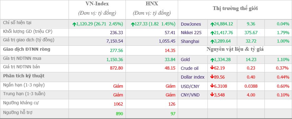 Thị trường chứng khoán Việt Nam trong 2 phiên vừa qua luôn mang đến những bất ngờ và khó hiểu cho nhà đầu tư. Sau phiên ồ ạt bán mạnh đợt ATC hôm qua, nhà đầu tư lại đua nhau gom hàng trong phiên hôm nay, giúp VN-Index lấy lại gần hết những gì đã mất. Kết thúc phiên giao dịch, VN-Index tăng 26,71 điểm (2,45%) lên 1.120,29 điểm với khối lượng giao dịch đạt 236,33 triệu CP, trị giá 7.150,54 tỷ đồng; HNX-Index tăng 1,82 điểm (1,45%) lên 127,33 điểm với khối lượng giao dịch đạt 57,41 triệu CP, trị giá 1.055,45 tỷ đồng.
