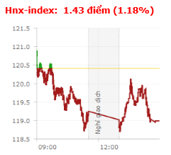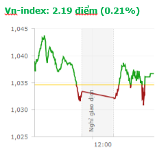 | Tổng hợp: Áp lực chốt lời khá mạnh trong phiên hôm nay khiến cho 2 chỉ số có sự phân hóa đáng kể. Kết thúc phiên giao dịch, VN-index tăng 2,19 điểm (0,21%) lên 1.036,69 điểm với khối lượng giao dịch đạt 173,15 triệu CP, trị giá 5.014,25 tỷ đồng; HNX-Index giảm 1,43 điểm (-1,18%) xuống còn 118,99 điểm với khối lượng giao dịch đạt 48,19 triệu CP, trị giá 709,46 tỷ đồng. |