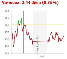 | Tổng hợp: Áp lực bán có phần gia tăng tại nhiều mã vốn hóa lớn khiến cho 2 chỉ số tiếp tục có phiên thứ 2 trái chiều. Kết thúc phiên giao dịch, VN-Index giảm 3,44 điểm (-0,36%) xuống 956,79 điểm với khối lượng giao dịch khớp lệnh đạt 162,14 triệu CP, trị giá 4.862,36 tỷ đồng. HNX-Index duy trì được sắc xanh và tăng nhẹ 0,12 điểm (0,11%) lên 105,71 điểm với khối lượng giao dịch đạt 36,21 triệu CP, trị giá 482,86 tỷ đồng.