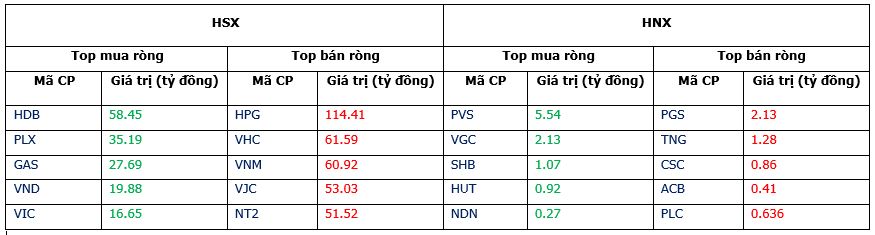 Sau phiên mua ròng kỷ lục hôm qua, thì khối ngoại đã quay lại trạng thái bán ròng trong phiên hôm nay. Trên sàn HOSE, khối ngoại bán ròng 3,97 triệu đơn vị với tổng giá trị tương ứng 224,54 tỷ đồng; trong khi phiên trước đó mua ròng 92,27 triệu đơn vị, tổng giá trị mua ròng lên tới 4.109,64 tỷ đồng. Trên sàn HNX, khối này mua ròng 237.881 đơn vị, tương ứng tổng giá trị 28,95 tỷ đồng, giảm mạnh hơn 96% cả về lượng và giá trị so với phiên trước (mua ròng 6,76 triệu đơn vị, tổng giá trị 96,05 tỷ đồng).