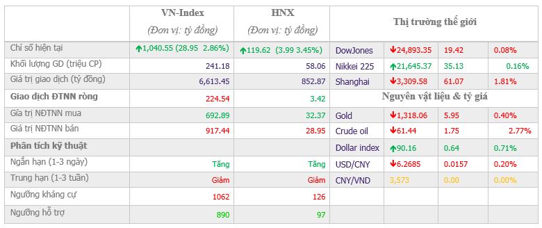 Sau 2 phiên lao dốc mạnh, thị trường CKVN đã có phiên hồi phục và bật tăng cao trong ngày hôm nay nhờ lực đẩy của nhóm CP vốn hóa lớn, ngân hàng và đầu cơ. Kết thúc phiên giao dịch, VN-Index tăng 28,95 điểm (2,86%) lên 1.040,55 điểm với khối lượng giao dịch đạt 241.18 triệu CP, trị giá 6,613.45 tỷ đồng; HNX-Index tăng 3,99 điểm (3,45%) lên 119,62 điểm với khối lượng giao dịch đạt 58,06 triệu CP, trị giá 852,87 tỷ đồng.