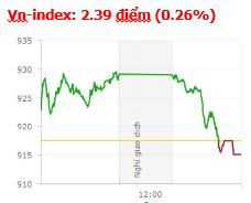 | Tổng hợp: Thanh khoản quá kém đã khiến lực cầu giá xanh không thể duy trì. Các chỉ số thị trường theo đó đã không thể giữ nhịp hồi phục và đồng loạt quay đầu giảm điểm. Kết thúc phiên giao dịch, VN-Index giảm 2,39 điểm (-0,26%) xuống còn 915,12 điểm với khối lượng giao dịch đạt 119,91 triệu CP, trị giá 2.737,4 tỷ đồng; HNX-Index tăng nhẹ 0,06 điểm (0,06%) lên 100.76 điểm với khối lượng giao dịch đạt 33,35 triệu CP, trị giá 521,59 tỷ đồng.