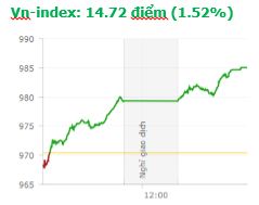 Nhận được sức cầu mạnh mẽ, đặc biệt từ khối ngoại, nhóm cổ phiếu bluechips đồng loạt tăng điểm mạnh, giúp VN-Index tăng gần 15 điểm - cao nhất trong 1,5 tháng qua. Kết thúc phiên giao dịch, VN-Index tăng 14,72 điểm (1,52%) lên 985,06 điểm với khối lượng giao dịch đạt 192,8 triệu CP, trị giá 4.408,7 tỷ đồng; HNX-Index tăng 0,74 điểm (0,66%) lên 111,43 điểm với khối lượng giao dịch đạt 43 triệu CP, trị giá 544,3 tỷ đồng. Khối ngoại tiếp tục duy trì phiên mua ròng thứ 3 liên tiếp với giá trị giao dịch tăng khá mạnh so với các phiên trước. Cụ thể, trên sàn HSX họ giao dịch trị giá 1.981,8 tỷ với giá trị mua ròng đạt 483,4 tỷ đồng. Trên sàn HNX, họ giao dịch trị giá 41,13 tỷ với giá trị bán ròng đạt 14,33 tỷ đồng.