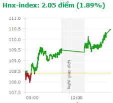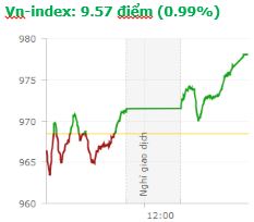 | Tổng hợp: Dòng tiền nhập cuộc mạnh mẽ với sự dẫn dắt của nhóm CP tài chính, kéo thị trường tăng điểm và đóng phiên ở mức cao nhất ngày. Kết thúc phiên giao dịch, VN-Index tăng 9,57 điểm (0,99%) lên 978,04 điểm với khối lượng giao dịch đạt 213,22 triệu CP, trị giá 5045,65 tỷ đồng; HNX-Index tăng 2,05 điểm (1,89%) lên 110,46 điểm với khối lượng giao dịch đạt 59,75 triệu CP, trị giá 847,4 tỷ đồng.