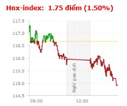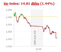 | Tổng hợp: Không nhận được sự ủng hộ của dòng tiền trong bối cảnh áp lực bán gia tăng khiến nhiều mã bluechips chìm trong sắc đỏ, từ đó kéo các chỉ số giảm mạnh. Kết thúc phiên giao dịch, VN-Index giảm 14,81 điểm (-1,44%) xuống còn 1.015,72 điểm với khối lượng giao dịch đạt 166,57 triệu CP, trị giá 4.590 tỷ đồng; HNX-Index giảm 1,75 điểm (-1,5%) xuống 114,91 điểm với khối lượng giao dịch đạt 40,2 triệu CP, trị giá 526,61 tỷ đồng. |