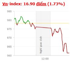 | Tổng hợp: Một phiên giao dịch khá tiêu cực với áp lực bán gia tăg mạnh về cuối phiên, nhấn chìm cả 2 chỉ số trong sắc đỏ. Kết thúc phiên, VN-Index giảm 16,9 điểm (-1,73%) xuống 961,37 điểm với khối lượng giao dịch đạt 188,94 triệu CP, trị giá 4.455,41 tỷ đồng; HNX-Index giảm 1,77 điểm (-1,61%) xuống 108,02 điểm với khối lượng giao dịch đạt 63,89 tỷ đồng.