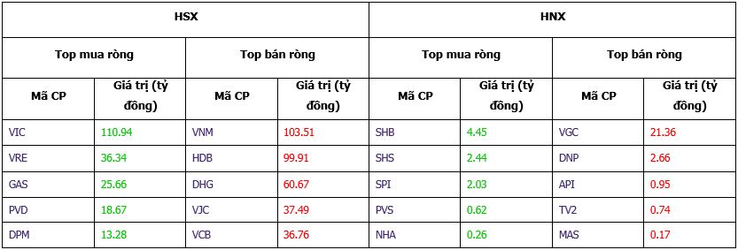 Sau phiên bán ròng mạnh hơn 270 tỷ hôm qua, khối ngoại có thêm một phiên bán ròng nữa nhưng giảm đáng kể về khối lượng và giá trị khi chưa đến 100.000 đơn vị và giá trị 18 tỷ đồng. Hôm nay, VIC vẫn là mã được khối ngoại ưu ái mua ròng nhất, nhưng giá cổ phiếu lại mất gần 3%. Trên sàn HOSE, khối ngoại mua ròng hơn 1,21 triệu đơn vị, với tổng giá trị mua ròng tương ứng 10,1 tỷ đồng. Trong khi phiên trước, khối này bán ròng gần 2,5 triệu đơn vị, giá trị bán ròng 215,81 tỷ đồng. Trên sàn HNX, khối ngoại bán ròng 267.351 đơn vị, với tổng giá trị bán ròng tương ứng 11,09 tỷ đồng. Trong khi phiên trước mua ròng 157.251 đơn vị, tổng giá trị là bán ròng 15,65 tỷ đồng.