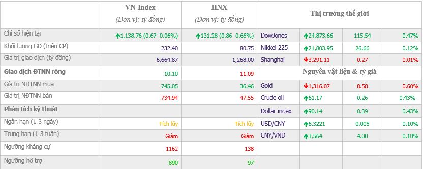 Tiếp tục là nhóm CP ngân hàng tiếp sức và duy trì sắc xanh cho thị trường trước áp lực điều chỉnh của nhóm CP vốn hóa lớn. Kết phiên giao dịch, VnIndex tăng nhẹ 0,67 điểm (0,06%) lên 1.138,76 điểm với khối lượng giao dịch đạt 232,40 triệu CP, trị giá 6.664,87 tỷ đồng; Hnx-Index tăng 0,86 điểm (0,66%) lên 131,28 điểm với khối lượng giao dịch đạt 80,75 triệu CP, trị giá 1.268 tỷ đồng.