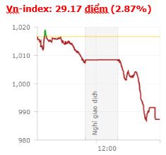 | Tổng hợp: Lực cung ồ ạt trong phiên chiều đã khiến cả 2 bảng điện tử chìm trong sắc đỏ, đẩy 2 chỉ số chính lao dốc mạnh, trong đó VN-Index xuyên thủng mốc 1.000 điểm. Kết thúc phiên giao dịch, Vn-index giảm 29,17 điểm (2,87%) xuống 987,34 điểm với khối lượng giao dịch đạt 181,39 triệu CP, trị giá 4.626,44 tỷ đồng; Hnx-Index giảm 2,85 điểm (2,46%) còn 113,05 điểm với khối lượng giao dịch đạt 41,47 triệu CP, trị giá 715,05 tỷ đồng. |