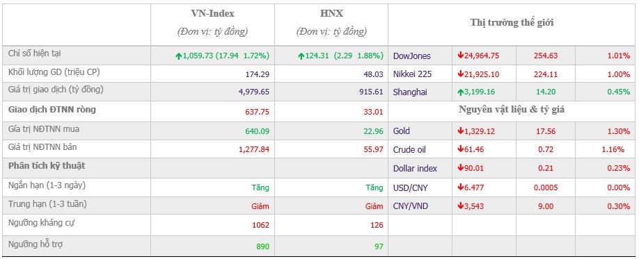 Mặc dù là ngày giao dịch cuối cùng của năm âm lịch, nhưng lực cầu duy trì khá đều dặn và tích cực từ lúc mở cửa cho đến hết phiên, khép lại một phiên giao dịch đầy phấn khởi cho nhà đầu tư. Kết thúc phiên giao dịch, chỉ số VnIndex đóng cửa tăng 17,94 điểm (1,72%) lên 1.059,73 điểm với khối lượng giao dịch đạt 174,29 triệu CP, trị giá 4.979,65 tỷ đồng; Hnx-Index tăng 2,29 điểm (1,88%) lên 124,31 điểm với khối lượng giao dịch đạt 48,03 triệu CP, trị giá 915,61 tỷ đồng.