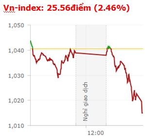 | TỔNG HỢP Lực bán bất ngờ gia tăng mạnh trong phiên chiều khiến các chỉ số lao dốc, đóng cửa ở mức thấp nhất ngày. Kết phiên, VN-Index giảm 25,56 điểm (-2.46%) xuống mức 1.014,9 điểm với khối lượng giao dịch đạt 123,09 triệu CP, trị giá 3.716,03 tỷ đồng; Hn-index giảm 1,16 điểm (-1,33%) xuống 119,66 điểm với khối lượng giao dịch đạt 35,11 triệu CP, trị giá 523,7 tỷ đồng.