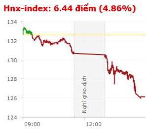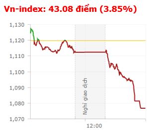 | Tổng hợp: (Phiên giao dịch ngày 23/04/2018). Sau phiên hồi phục hôm thứ Sáu tuần trước (20/4), thị trường lại chứng khiến nhà đầu tư ồ ạt tháo chạy trong phiên đầu tuần mới (23/4) khiến các chỉ số lao dốc không phanh. Kết thúc phiên giao dịch, VN-Index giảm 43,08 điểm (-3,85%) xuống 1.076,78 điểm với khối lượng giao dịch đạt 217,97 triệu CP, trị giá 7.142,35 tỷ đồng; HNX-Index giảm 6,44 điểm (-4,86%) xuống còn 126,14 điểm với khối lượng giao dịch đạt 71,65 triệu CP, trị giá 1.223,92 tỷ đồng.