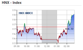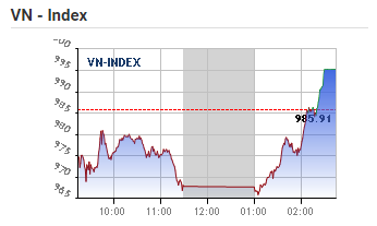 Trái ngược với phiên hôm qua, lực cầu bắt đáy đã gia tăng khá mạnh về cuối phiên, qua đó giúp các chỉ số đảo chiều tăng điểm thành công. Kết thúc phiên giao dịch, VN-Index tăng 3,03 điểm (0,31%) lên 988,94 điểm với khối lượng giao dịch đạt 182,16 triệu CP, trị giá 6.628,29 tỷ đồng; HNX-Index tăng 1,39 điểm (1,19%) lên 118,11 điểm với khối lượng giao dịch đạt 48,18 triệu CP, trị giá 648,83 tỷ đồng.