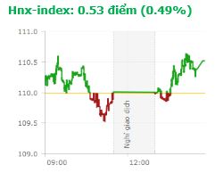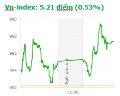 | Tổng hợp: Áp lực bán gia tăng và dòng tiền vào thị trường thận trọng hơn trong thời gian cuối phiên, nhưng nhiều cổ phiếu vốn hóa lớn vẫn giữ được đà tăng tích cực, giúp thị trường duy trì sắc xanh. Kết thúc phiên giao dịch, VN-Index tăng 5,21 điểm (0,53%) lên 987,36 điểm với khối lượng giao dịch đạt 146,85 triệu CP, trị giá 3.508,4 tỷ đồng; HNX-Index tăng 0,53 điểm (0,49%) lên 110,52 điểm với khối lượng giao dịch đạt 33,3 triệu CP, trị giá 486,9 tỷ đồng.