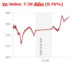 | Tổng hợp: Lực cầu bắt đáy về cuối phiên khá manh, giúp các chỉ số có sự hồi phục đáng kể, nhưng đóng cửa vẫn nằm trong sắc đỏ. Kết thúc phiên giao dịch, chỉ số VNIndex giảm 7,5 điểm (0,76%) xuống mức 983,02 điểm với khối lượng giao dịch đạt 165,4 triệu CP, trị giá 3.627,3 tỷ đồng; HNX-Index giảm 1,07 điểm (0,96%) xuống 110,92 điểm với khối lượng giao dịch đạt 27,14 triệu CP, trị giá 399,6 tỷ đồng.