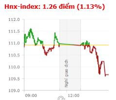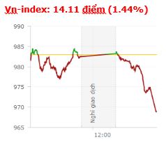| Tổng hợp: Nỗ lực hồi phục trong nửa cuối phiên sáng với sự trở lại của nhóm bluechip, nhưng lực bán mạnh diễn ra trong phiên chiều, đặc biệt là vào cuối phiên khiến thị trường lao mạnh, đóng cửa ở mức thấp nhất ngày. Kết thúc phiên giao dịch, VN-Index giảm 14,11 điểm (-1,44%) xuống còn 968,91 điểm với khối lượng giao dịch đạt 179,45 triệu CP, trị giá 5.910,94 tỷ đồng; HNX-Index giảm 1,26 điểm (-1,13%) xuống còn 109,66 điểm với khối lượng giao dịch đạt 42,73 triệu CP, trị giá 641,9 tỷ đồng.