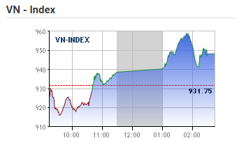 | TỔNG HỢP: Sự sụt giảm mạnh của VN-Index đã kích hoạt dòng tiền bắt đáy cộng với việc mua vào trở lại của khối ngoại đã tạo ra sự hứng phấn khiến cho thị trường bứt phá, đảo chiều rất ấn tượng trong phiên hôm nay. Kết thúc phiên giao dịch, VN-Index tăng 20,43 điểm (2,19%) lên 952,18 điểm với khối lượng giao dịch đạt 183,99 triệu CP, trị giá 5.339,82 tỷ đồng; HNX-Index tăng 5,51 điểm (5,13%) lên 112,88 điểm với khối lượng giao dịch đạt 50,26 triệu CP, trị giá 693,19 tỷ đồng. |