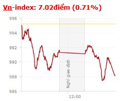 Nỗ lực "bắt đáy" trong những phút cuối phiên là không đủ giúp thị trường tránh khỏi phiên giảm sâu trước áp lực chốt lời tăng vọt tại nhóm CP vốn hóa lớn. Kết thúc phiên giao dịch, VN-Index giảm 7,02 điểm (-0,71%) xuống 988,17 điểm với khối lượng giao dịch đạt 176,89 triệu CP, trị giá 4.049,78 tỷ đồng; HNX-Index tăng 0,54 điểm (0,48%) lên 112,78 điểm với khối lượng giao dịch đạt 39,4 triệu CP, trị giá 612,21 tỷ đồng. Sau phiên đột phá mua ròng hôm qua, thì khối ngoại lại quay về trạng tái bán ròng trong phiên hôm nay. Cụ thể, trên sàn HSX họ giao dịch trị giá 939,76 tỷ với giá trị bán ròng đạt 94,38 tỷ đồng. Trên sàn HNX, họ giao dịch trị giá 34,97 tỷ vớigi á trị mua ròng đạt 5,11 tỷ đồng.