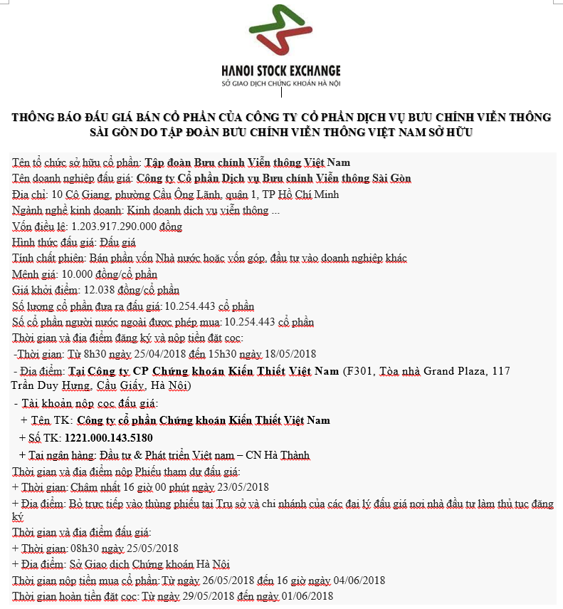 Có 0 bình luận, đánh giávề THÔNG BÁO ĐẤU GIÁ BÁN CỔ PHẦN CỦA CÔNG TY CỔ PHẦN DỊCH VỤ BƯU CHÍNH VIỄN THÔNG SÀI GÒN DO TẬP ĐOÀN BƯU CHÍNH VIỄN THÔNG VIỆT NAM SỞ HỮU
