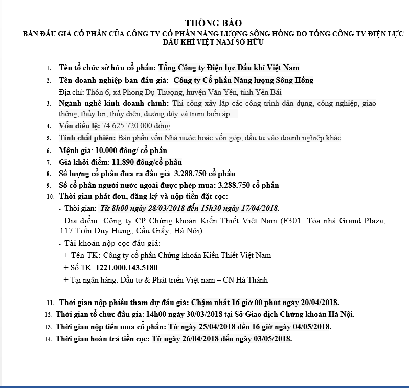 THÔNG BÁO ĐẤU GIÁ BÁN CỔ PHẦN CỦA CÔNG TY CỔ PHẦN NĂNG LƯỢNG SÔNG HỒNG DO TỔNG CÔNG TY ĐIỆN LỰC DẦU KHÍ VIỆT NAM SỞ HỮU