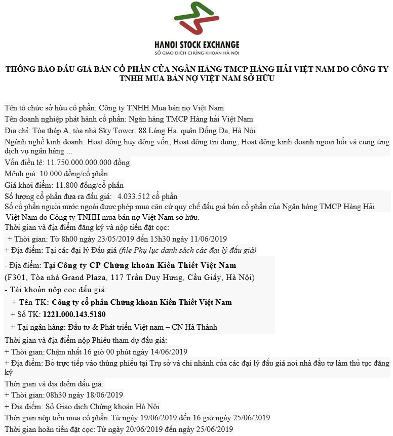 THÔNG BÁO ĐẤU GIÁ BÁN CỔ PHẦN CỦA NGÂN HÀNG TMCP HÀNG HẢI VIỆT NAM DO CÔNG TY TNHH MUA BÁN NỢ VIỆT NAM SỞ HỮU