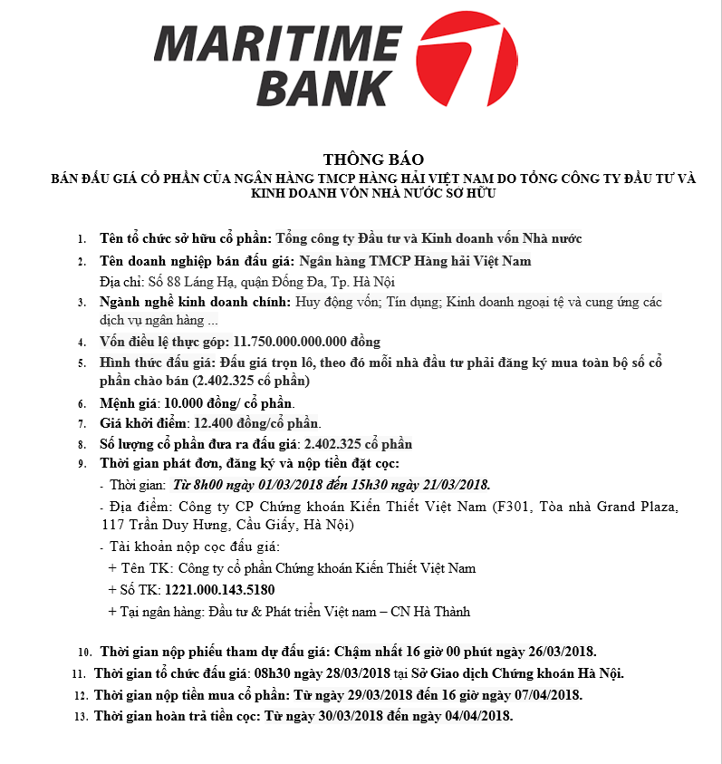 THÔNG BÁO ĐẤU GIÁ BÁN CỔ PHẦN CỦA NGÂN HÀNG TMCP HÀNG HẢI VIỆT NAM DO TỔNG CÔNG TY ĐẦU TƯ VÀ KINH DOANH VỐN NHÀ NƯỚC SỞ HỮU