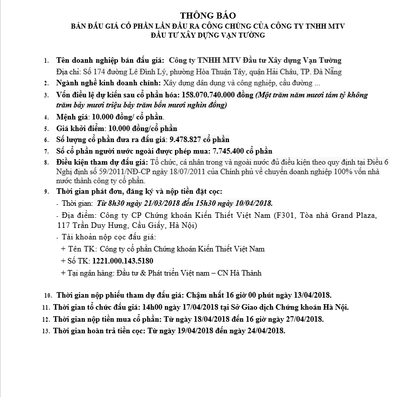 THÔNG BÁO ĐẤU GIÁ BÁN CỔ PHẦN LẦN ĐẦU RA CÔNG CHÚNG CỦA CÔNG TY TNHH MTV ĐẦU TƯ XÂY DỰNG VẠN TƯỜNG