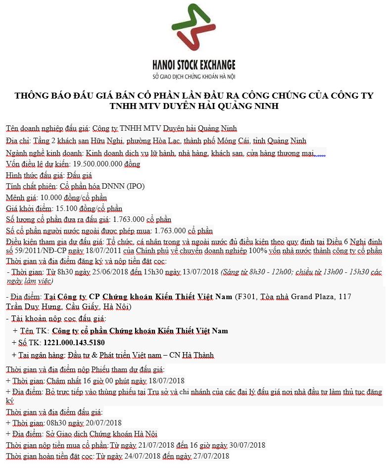 THÔNG BÁO ĐẤU GIÁ BÁN CỔ PHẦN LẦN ĐẦU RA CÔNG CHÚNG CỦA CÔNG TY TNHH MTV DUYÊN HẢI QUẢNG NINH
