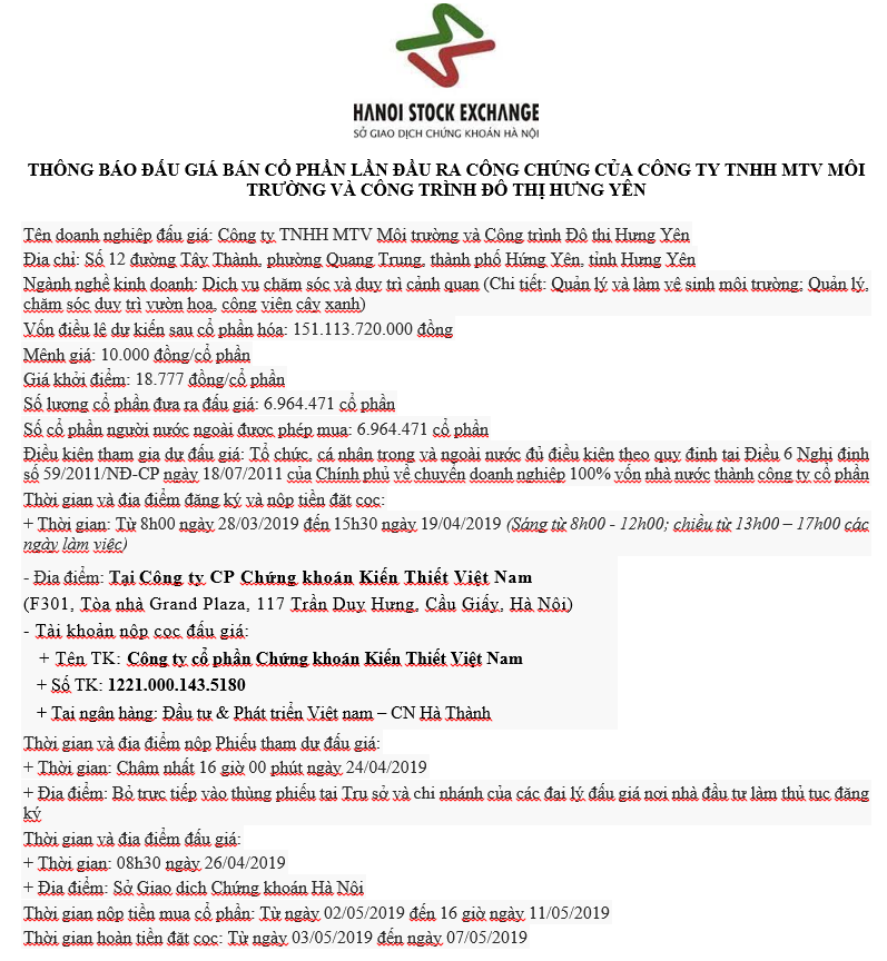 THÔNG BÁO ĐẤU GIÁ BÁN CỔ PHẦN LẦN ĐẦU RA CÔNG CHÚNG CỦA CÔNG TY TNHH MTV MÔI TRƯỜNG VÀ CÔNG TRÌNH ĐÔ THỊ HƯNG YÊN