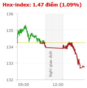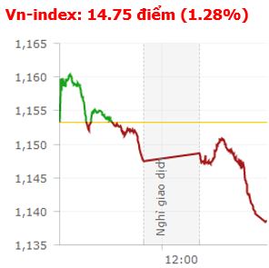 Sau phiên hồi phục nhẹ với thanh khoản thấp hôm qua, VN-Index đã nhanh chóng giảm mạnh trong phiên hôm nay, xuyên thủng mốc 1.140 điểm khi lực cung gia tăng. Kết thúc phiên giao dịch, VN-Index giảm 14,75 điểm (-1,28%) xuống 1.138,53 điểm với khối lượng giao dịch đạt 172,1 triệu CP, trị giá 5.356,38 tỷ đồng; HNX-Index giảm 1,47 điểm (-1,09%) xuống 132,78 điểm với khối lượng giao dịch đạt 60,77 triệu CP, trị giá 897,86 tỷ đồng.
