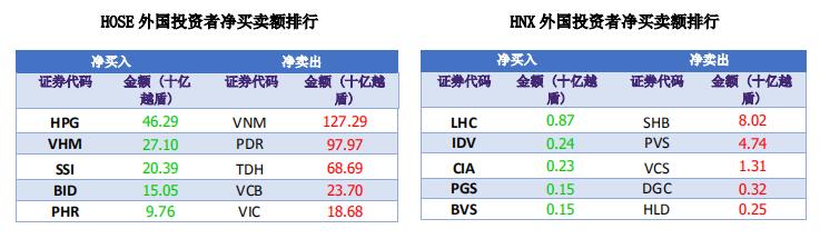 本周外资重回净买入,胡志明交易所和河内交易所净买入总额约3500亿越南盾。值得注意的是,周一外资净买入近3500亿越南盾,买盘集中于FUEVFVND(1976亿越南盾),VNM(650亿越南盾),HPG(639亿越南盾)。