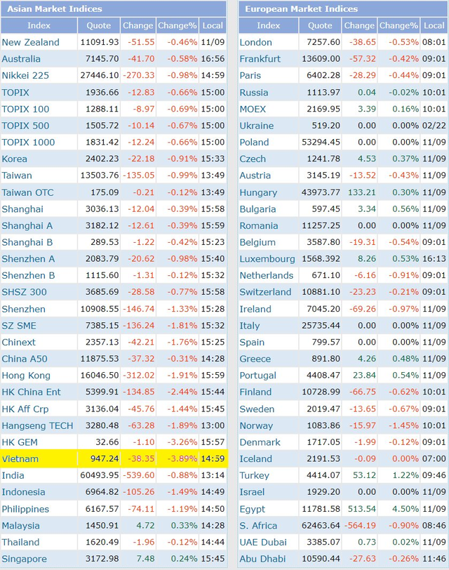 11月10日的交易日,越南股市全线普跌。盘中越南指数有时下跌 50 点,数百只股票跌停,然后在尾盘时逐渐收窄跌幅。收盘时,市场有300多只股封死跌停板,其中VN30指数有11只股票跌停,且没有上涨股票。