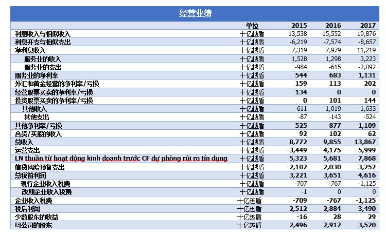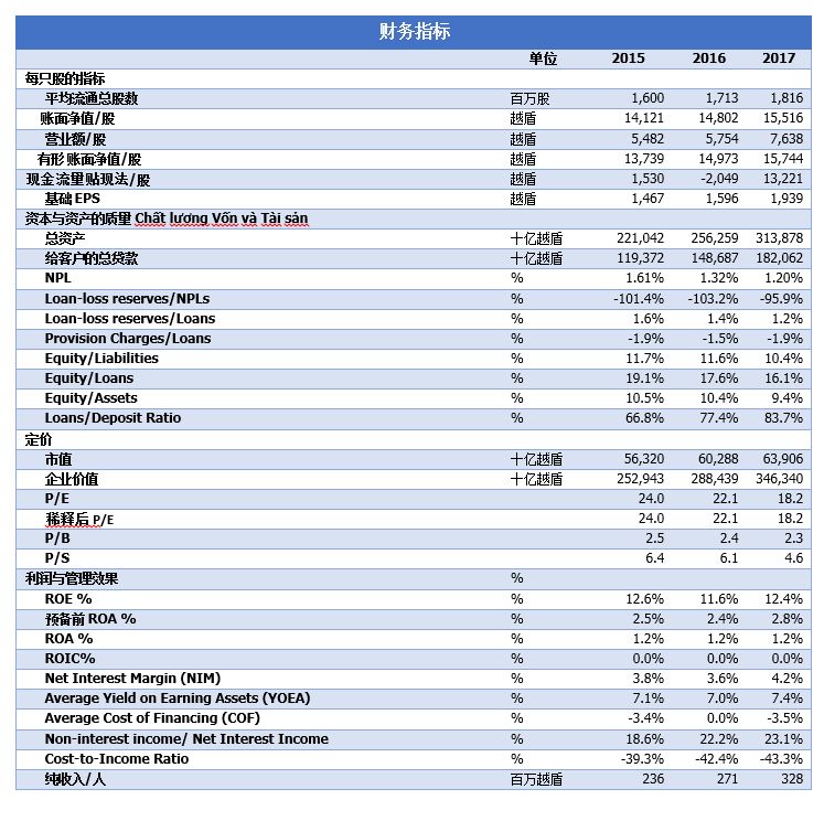 1. MBB 2017年经营业绩更新:2017年MBB几乎完成所提出的计划。 2017年MBB的纯收入达13.867万亿越盾,较2016年涨40.7%。其综合税前利润达6.616万亿越盾。其ROE和ROA分别为12.4%和1.2%。总行的ROE与ROA分别为16.1%和1.5%。