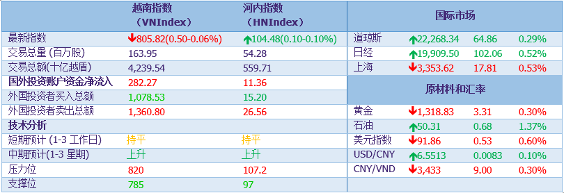综合:9月15日市场小幅震荡上扬。截至收盘,越南指数(VN-index)下跌0.5点(-0,06%),报805,82点。河内指数(HNX-Index)微涨0,1点(0,1%),报104,49。
