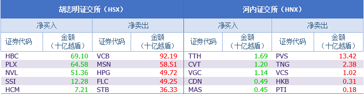 胡志明证交所(HSX)和河内证交所(HNX)外国投资者净买卖额排行