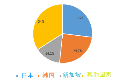 从投资对象上看,有112个国家和地区在越南有投资项目,其中日本的投资项目量居首,达89.4亿美金,占外资投资总额的27%。韩国位居第二,投资总额达81.8亿美金,占外资投资总额的24.7%。新加坡位居第三, 投资总额达46.9亿美金,占外资投资总额的14.2%。