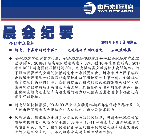 2018年6月6日,隶属于中国知名券商申万宏源证券有限公司的上海申银万国证券研究所有限公司(以下简称申万研究所),通过晨会纪要的方式,推出了《越南:十多年前的中国?---走进越南系列报告之一:宏观策略篇》,以系列报告的形式将对做为越南进行深度调查。